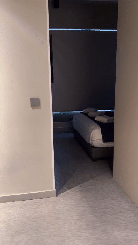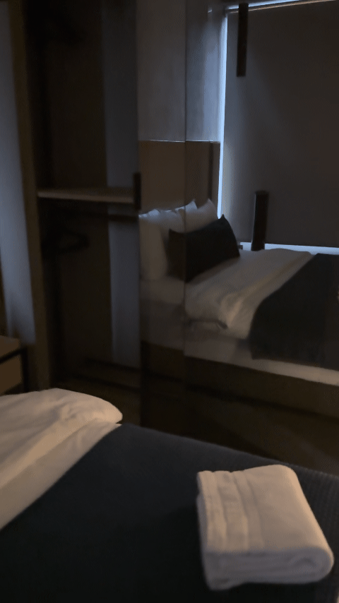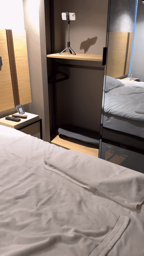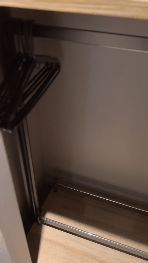 是的,这个地方有一个面向床的玻璃衣柜,并有上下两层。